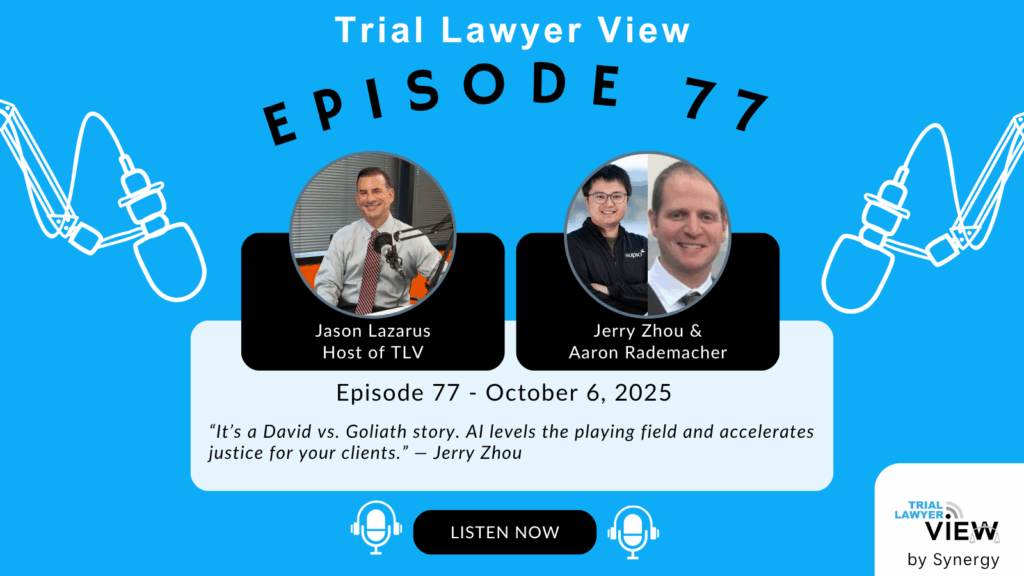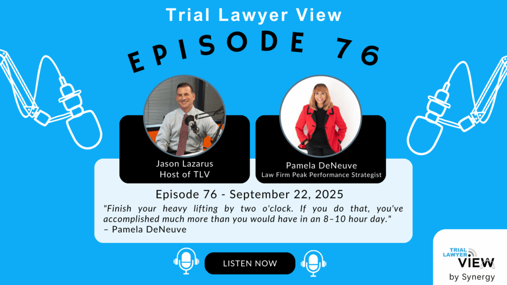 Trial Lawyer View, the go-to podcast for personal injury trial lawyers. Hosted by Jason D. Lazarus, a renowned attorney expert to fellow lawyers and author of The Art of Settlement & Litigation to Life. The podcast explores cutting-edge topics in personal injury law, covering best practices, firm growth strategies, and ways to accelerate success. As part of Peak Practice by Synergy, a community dedicated to helping to optimize personal injury practices, the podcast also delves into firm operations, marketing, technology, and more.Â