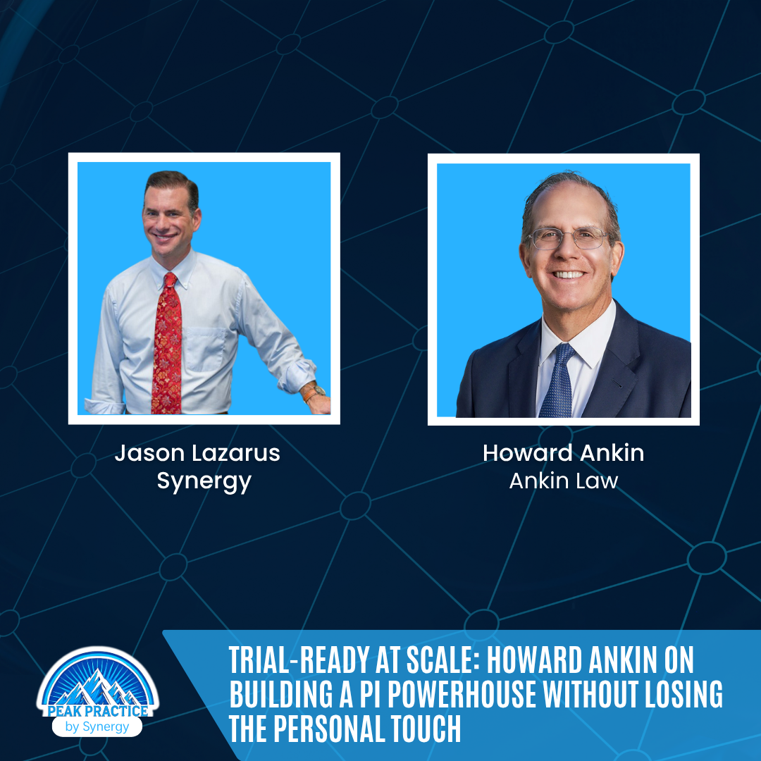 Howard Ankin’s model matters to Peak Practice because it proves you can build real capacity without sacrificing the human touch. His focus on trial-readiness, visual storytelling, and disciplined expert work shows how process and craftsmanship can live side by side. By defining “personal” at scale and funding the tools that move cases faster and smarter, he sets a path for firms that want growth with integrity. This aligns with Peak’s mission to help PI leaders build durable systems, while synergy. removes friction through lien resolution so your team can stay focused on advocacy, outcomes, and long-term client trust.